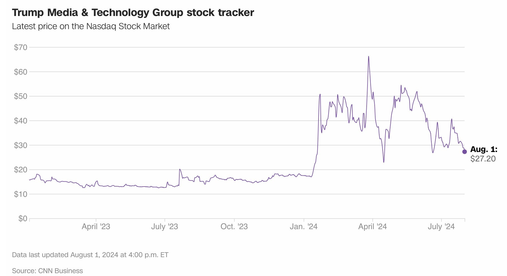 Tháng 6, giá trị cổ phiếu của Trump Media đã tăng đột biến sau màn tranh luận yếu kém của Tổng thống Joe Biden. Cổ phiếu đã tăng trở lại sau khi ông Trump sống sót sau một vụ ám sát không thành tại bang Pennsylvania.