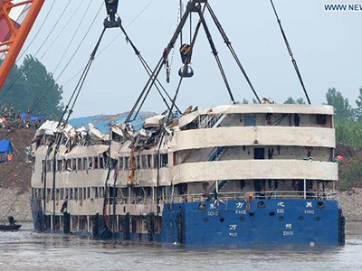 Tàu chở 456 người chìm trên sông Trường Giang vừa được nâng lên, sau khi lực lượng cứu hộ lật nó lại sáng nay.