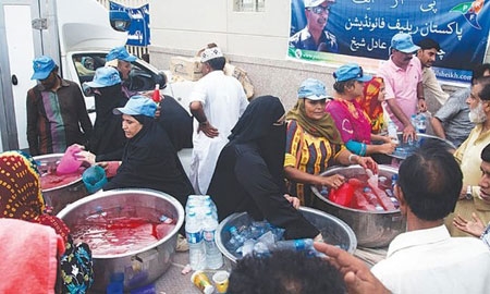 Các tình nguyện viên phát nước cho những người say nắng ở TP Karachi. Ảnh: AP |