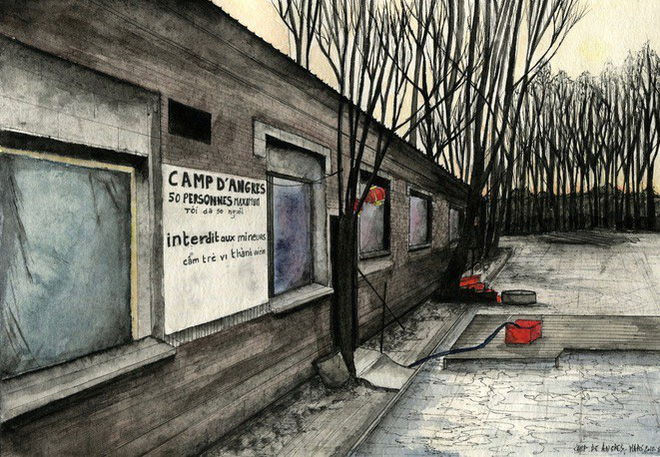 Trên bức tường bạc phếch của tòa nhà chính trong trại treo một tấm biển bằng tiếng Pháp và tiếng Việt đề: "Trại Angres, tối đa 50 người, cấm trẻ vị thành niên".