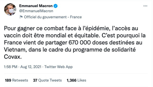 "Để chiến thắng trong cuộc chiến với dịch bệnh, việc tiếp cận vắc xin phải mang tính toàn cầu và bình đẳng. Đây là lý do vì sao Pháp chia sẻ 670.000 liều vắc xin cho Việt Nam, như là một phần của chương trình COVAX" - Tổng thống Pháp Emmanuel Macron viết trên Twitter hôm nay.