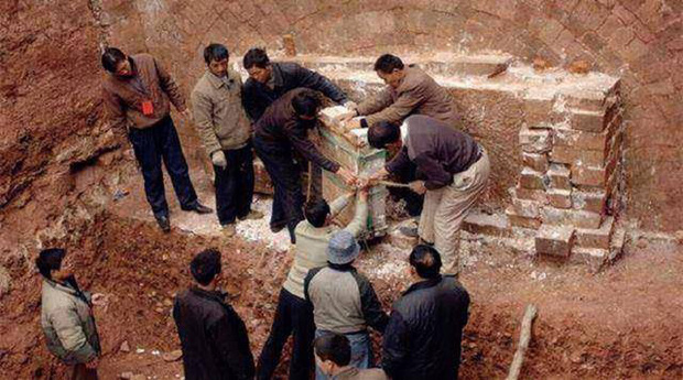 Dưới lớp đất, các chuyên gia khảo cổ đã tìm thấy một ngôi mộ cổ niên đại hơn 1.300 năm. Cánh cửa đá của ngôi mộ xuất hiện nhiều vết đánh dấu bằng bột thiếc màu đỏ, bên trong mộ xây bằng đất nung, chia làm hai buồng trái và phải.