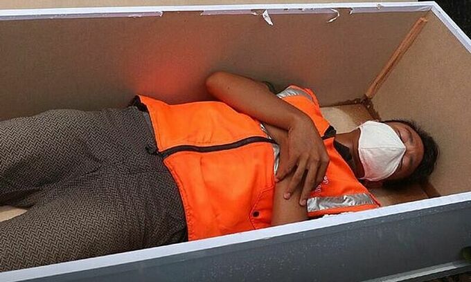 Giới chức ở thủ đô Jakarta, Indonesia, tuần trước cho hay những người vi phạm quy định đeo khẩu trang ngăn dịch Covid-19 được lựa chọn các hình phạt gồm lao động công ích, phạt hành chính hoặc nằm trong quan tài giả vài phút để "suy ngẫm" về nguy cơ từ hành động sai lầm của họ.
