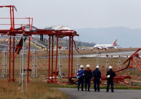 Video từ trên không tại sân bay Hiroshima, phía tây Nhật Bản, cho thấy hệ thống ăng ten hỗ trợ hạ cánh đã bị hư hại, các mảnh vỡ văng ra phía đường băng, hãng tin Pháp đưa tin. Hệ thống hỗ trợ hạ cánh là một kiến trúc lớn có hình dáng giống cánh cổng, cao 6 m và đặt xa đường băng.