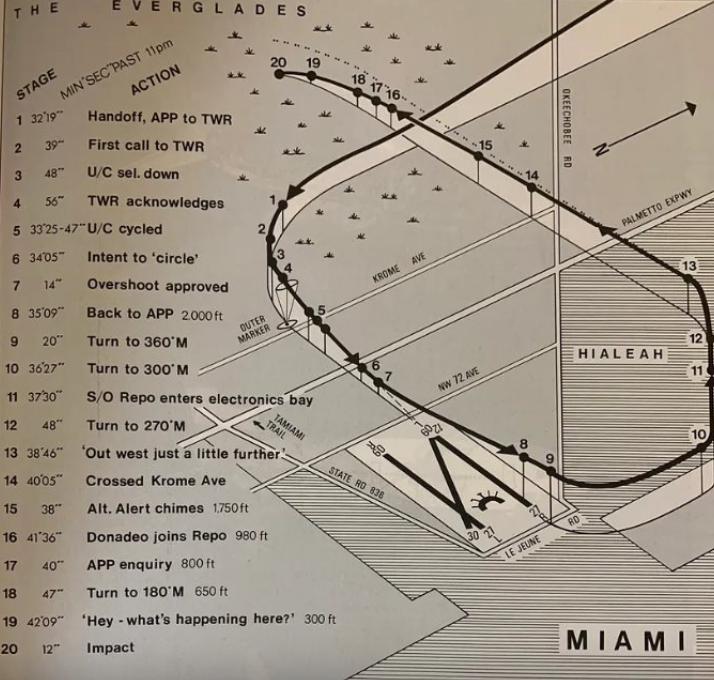 Vài giờ sau, L-1011 bắt đầu tiến vào không phận Miami. Cơ trưởng Loft lúc này kiểm tra thông tin tiếp cận và hạ cánh. Thời tiết quang đãng và các phi công nhìn thấy đường băng hiện ra trong tầm mắt. Máy bay lúc này chuẩn bị hạ cánh.
