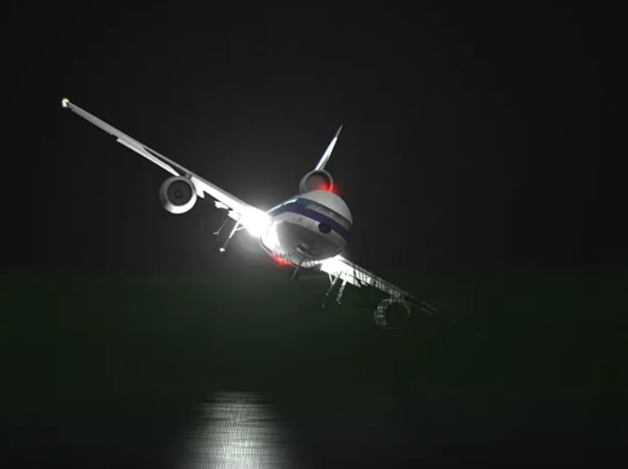 Đèn nhấp nháy rồi tắt, cabin tối đen. Kim loại va vào nhau phát ra âm thành chói tai. Chiếc L-1011 trượt dài hàng trăm mét. Nhiên liệu tràn bình và lửa bắt đầu bùng lên.