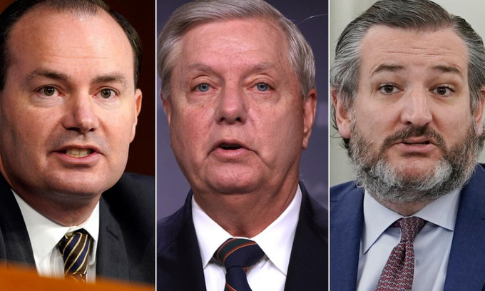 Nhóm thượng nghị sĩ đảng Cộng hòa gồm Ted Cruz, Mike Lee và Lindsey Graham hôm 11-2 tập trung tại một căn phòng gần Thượng viện, nơi nhóm luật sư của cựu Tổng thống Trump đang sử dụng để làm việc trong thời gian diễn ra phiên tòa luận tội ông.