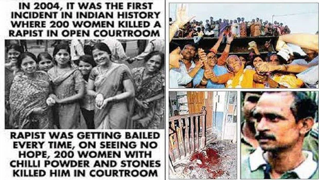 Vào lúc 3 giờ chiều ngày 13 tháng 8 năm 2004, gần 200 người phụ nữ là nạn nhân của tên Akku Yadav, mang theo dao cắt rau, đá và bột ớt tiến đến tòa án. Khi đi ngang qua đám đông đứng bên ngoài tòa, hắn còn chế nhạo một cô gái, gọi cô là gái điếm và đe dọa sẽ cưỡng hiếp cô một lần nữa. Nhân viên cảnh sát hộ tống hắn thì bật cười.