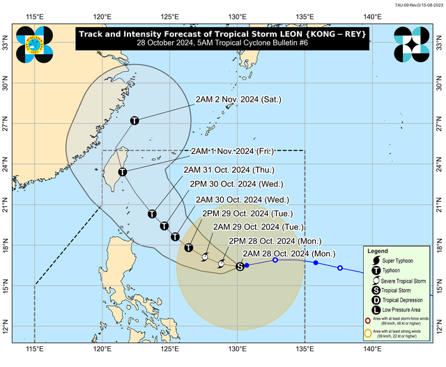 Theo bản tin sáng 28-10 của Cục Quản lý thiên văn, địa vật lý và khí quyển Philippines (PAGASA), bão Leon - tên quốc tế là Kong-rey - hiện vẫn giữ cấp "bão nhiệt đới" theo phân loại của cơ quan này và giảm tốc trên vùng biển phía Tây Philippines.