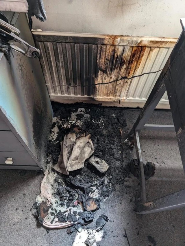 Phần lớn đồ vật trong phòng ngủ bị phá hủy — bao gồm một chiếc TV bị tan chảy và các bức tường bị đen. Điều may mắn là ngọn lửa chủ yếu được ngăn chặn bởi một cánh cửa đóng kín. Điều này ngăn đám cháy lan sang các khu vực khác của ngôi nhà.