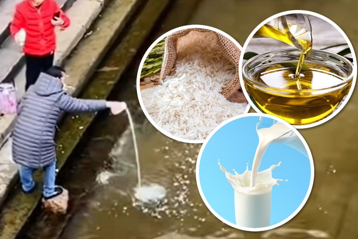 Một đoạn video quay lại cảnh một nhóm người phụ nữ ở tỉnh Hồ Nam, miền Nam Trung Quốc đã đổ lọ thực phẩm gồm gạo, bột mì, dầu ăn và sữa xuống một con sông hôm 26/11.