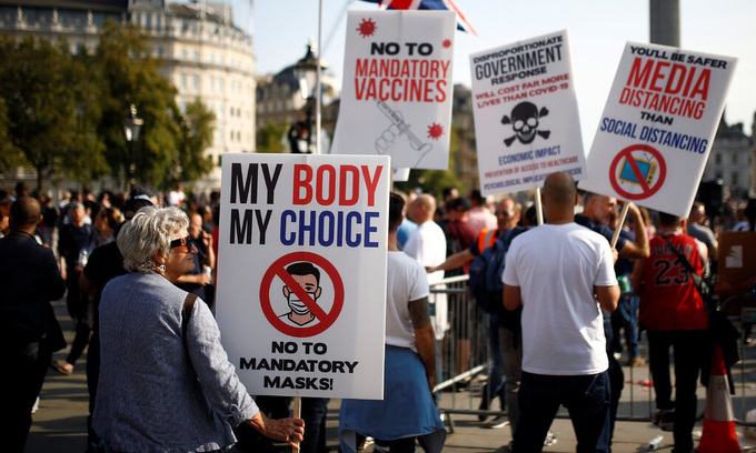 Thông điệp này được lan truyền khi hàng nghìn người biểu tình không đeo khẩu trang tập trung tại quảng trường Trafalgar ở trung tâm thủ đô London, Anh, hôm 26/9. Ít nhất 4 cảnh sát đã bị thương trong cuộc đụng độ với đám đông biểu tình phản đối biện pháp ngăn Covid-19 này.