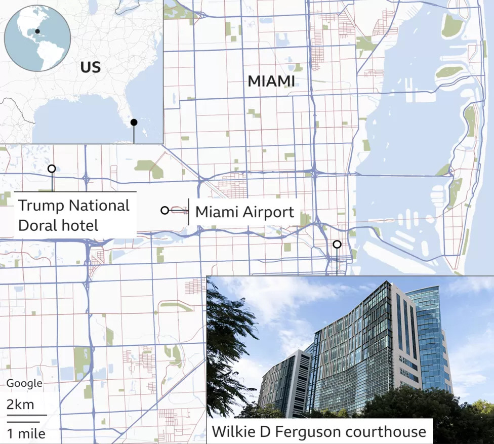 Với sự tháp tùng của các nhân viên Sở Mật vụ Mỹ, ông Trump dự kiến sẽ đi bằng xe hộ tống từ khách sạn đến tòa án Wilkie D Ferguson. Theo kế hoạch, phiên tòa sẽ bắt đầu lúc khoảng 15h giờ địa phương ngày 13/6 (2h giờ Việt Nam ngày 14/6). Tòa án cách khách sạn khoảng 18km.
