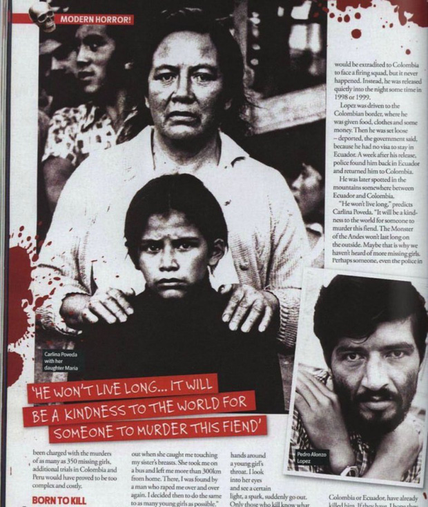 Ngay cả ở trong tù, López vẫn bị những gã đàn ông xấu xa tấn công, hãm hiếp tập thể. Hắn căm thù, trả đũa bằng cách cắt cổ của 3/4 phạm nhân đã xâm phạm mình. Ra tù, López bỏ Colombia, vượt biên sang Peru. Tại đất nước Nam Mỹ, hắn trở thành bóng ma yêu râu xanh, thoắt ẩn thoắt hiện trong rừng rậm, sát hại các bé gái thổ dân.