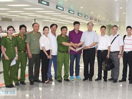 Đại diện Cục Cảnh sát truy nã tội phạm bàn giao hồ sơ, đối tượng truy nã Yin Wen Sheng (đứng giữa mặc áo phông tím) cho cơ quan chức năng Trung Quốc tại sân bay quốc tế Nội Bài. |