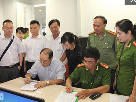 Đại diện cơ quan chức năng Trung Quốc và Cục Cảnh sát truy nã tội phạm Bộ Công an Việt Nam ký biên bản bàn giao hồ sơ và đối tượng. |