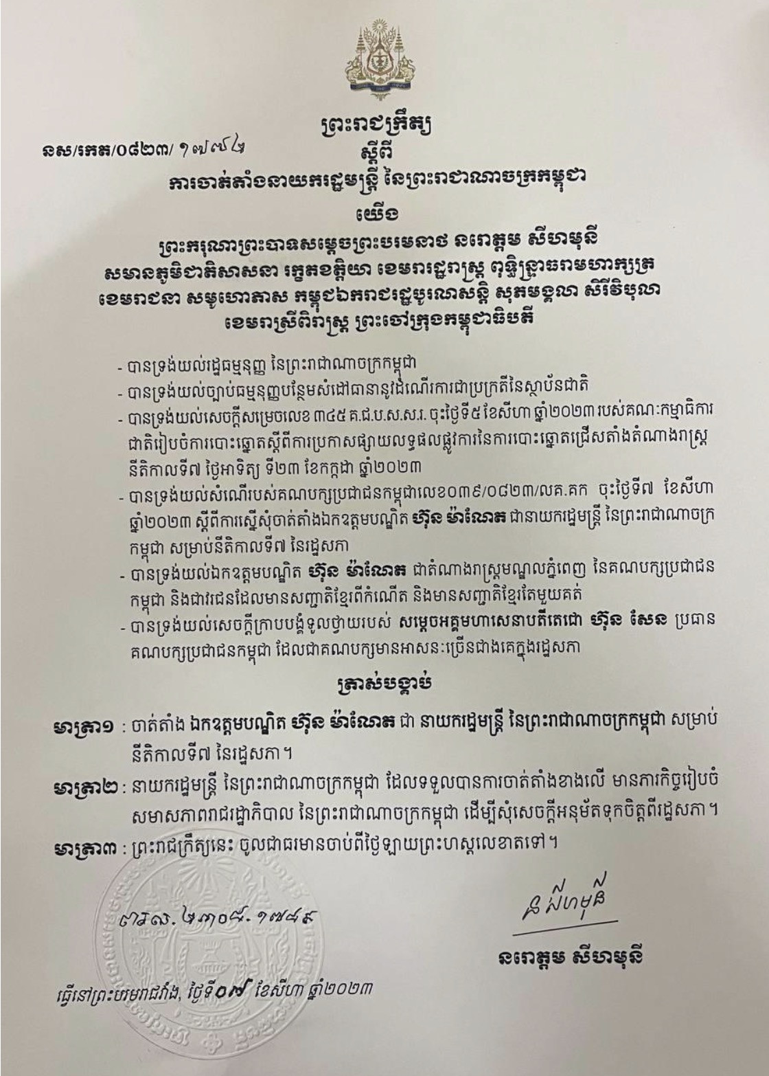 Sau khi giành chiến thắng vang dội trong cuộc bầu cử hồi tháng 7, ông Hun Sen tuyên bố sẽ từ chức Thủ tướng và trao quyền cho con trai cả là Hun Manet. Đảng Nhân dân Campuchia và Quốc vương Norodom Sihamoni đều ủng hộ, tán thành ông Hun Manet làm Thủ tướng.