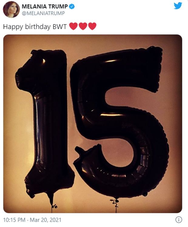 Người duy nhất trong gia đình Trump chúc mừng sinh nhật Barron công khai trên MXH chính là bà Melania - mẹ cậu bé. Cựu Đệ nhất phu nhân viết ngắn gọn trên trang Twitter cá nhân: "Chúc mừng sinh nhật BWT" ("BWT" là viết tắt tên đầy đủ Barron William Trump của cậu) cùng 3 biểu tượng trái tim.