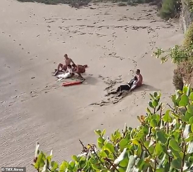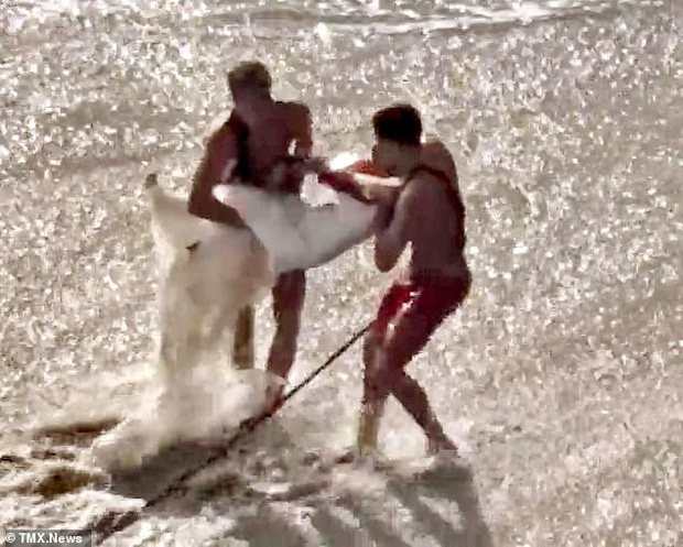Bị tấn công bất ngờ, cặp đôi hoảng loạn vùng vẫy dưới nước. Ngay lập tức, nhân viên cứu hộ địa phương và đội cứu hộ khẩn cấp đã có mặt tại hiện trường. Nhiều nhân viên đã nhảy xuống biển để đưa cô dâu chú rể lên bờ.