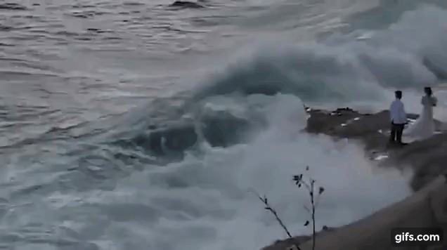 Theo đó, một cặp cô dâu chú rể (không rõ danh tính) đang đứng tạo dáng chụp ảnh cưới trên mỏm đá thì bất ngờ một con sóng to ập đến và cuốn họ xuống nước. Cả 2 đang điều chỉnh trang phục để có những bức ảnh đẹp nên không hề biết "quái vật" ập đến từ phía sau và kéo cặp đôi ra biển Thái Bình Dương.