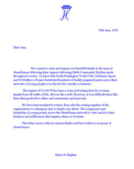 Theo đó, vào hôm 19/6, vợ chồng Harry - Meghan Markle đã gửi thư tới tổ chức thể thao quốc gia StreetGames ở Anh để bày tỏ sự cảm ơn của tổ chức này trong hoạt động giúp những người trẻ tại các khu vực chịu nhiều thiệt thòi. Bức thư sau đó được StreetGames vui mừng chia sẻ lại.