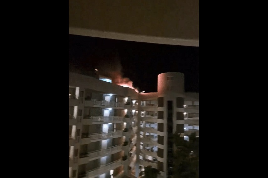 Hình ảnh từ các cư dân mạng chia sẻ trên trang X (trước đây là Twitter) cho thấy một cột lửa sáng rực bốc lên trên mái khách sạn.