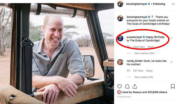 Ngay sau khi hình ảnh của Hoàng tử William được đăng lên, cặp đôi Harry - Meghan đã sử dụng tài khoản Instagram @SussexRoyal chính thức của họ viết bình luận ở dưới với lời chúc: "Chúc mừng sinh nhật Công tước xứ Cambridge".