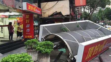 Nhiều biển hiệu bị giật đổ trong cơn bão. Các cơ quan, trường học buộc phải dừng hoạt động để tránh bão. |