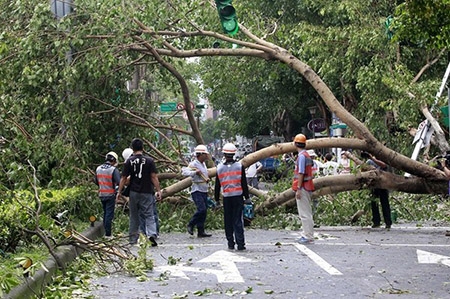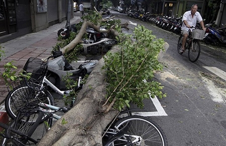 Thêm cây lớn bị bật gốc, đổ chắn ngang đường và đang chờ các công nhân môi trường di dời. Hàng nghìn chiến sĩ, nhân viên môi trường đã được huy động để khắc phục hậu quả do bão Dujuan gây ra. |