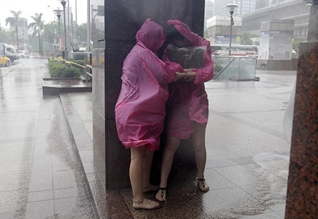 Hai cô gái nép sau chiếc cột để tránh mưa. Khoảng 3000 người, chủ yếu là du khách đã phải rời đảo Xanh và đảo Lan Tự trong ngày Chủ Nhật cùng khoảng 4000 người khác đến từ những địa phương mà Dujuan sẽ tấn công. |