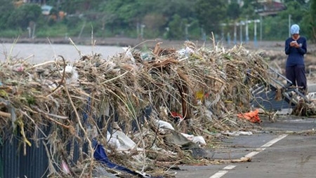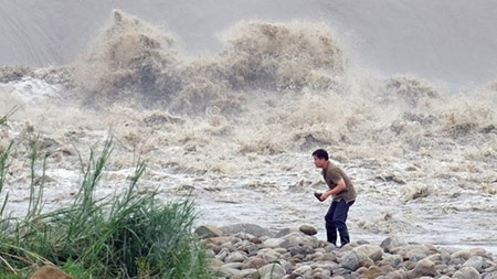 Cảnh rác thải bị gió cuốn lên lan can bờ sông Tân Điếm. Trong tháng 8, siêu bão Soudelor cũng quét qua Đài Loan và làm chết 8 người nước này, trong khi đó số thương vong ở Trung Quốc là 21 người. |