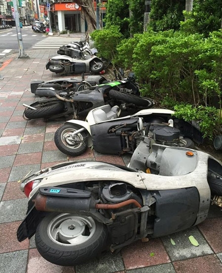 Xe cộ đổ rập trên vỉa hè do bị gió lớn tấn công. |
