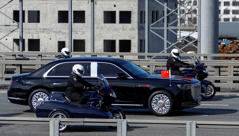 Đội xe limo màu đen chở Chủ tịch Tập Cận Bình và phái đoàn Trung Quốc đi qua các con đường ở Moscow bao gồm một mẫu cực hiếm – Hồng Kỳ N701, loại xe siêu sang được Trung Quốc sản xuất dành cho giới chức cấp cao.