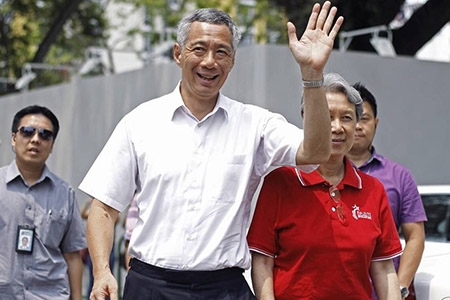 Ông Lý Hiển Long cùng vợ tới điểm bỏ phiếu hôm nay. Ảnh: WSJ |
