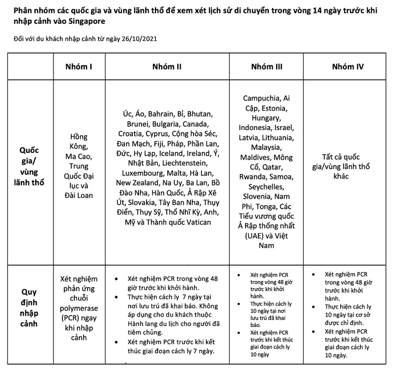 Theo STB, Singapore phân loại các quốc gia và vùng lãnh thổ thành bốn nhóm dựa trên đặc điểm tình hình và nguy cơ COVID-19. Đồng thời áp dụng các quy định nhập cảnh dựa trên tình trạng tiêm chủng cho từng nhóm.