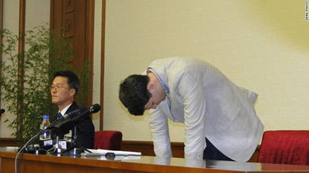 Warmbier cuối đầu xin lỗi. Ảnh: DPRK |