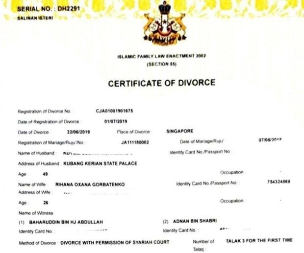 Sau 1 năm mặn nồng, cặp đôi đã chính thức đường ai nấy đi. Ngày 1/7, một văn bản xác nhận ly hôn có ấn tín bang Kelantan, được cho là bản sao do người vợ giữ, bị tiết lộ. Văn bản này cho biết quá trình ly hôn được thành lập bằng cách nói 3 lần từ “talak”, hình thức ly hôn nghiêm trọng nhất và không thể vãn hồi trong Hồi giáo. Hai người đã ly hôn khi ở Singapore.