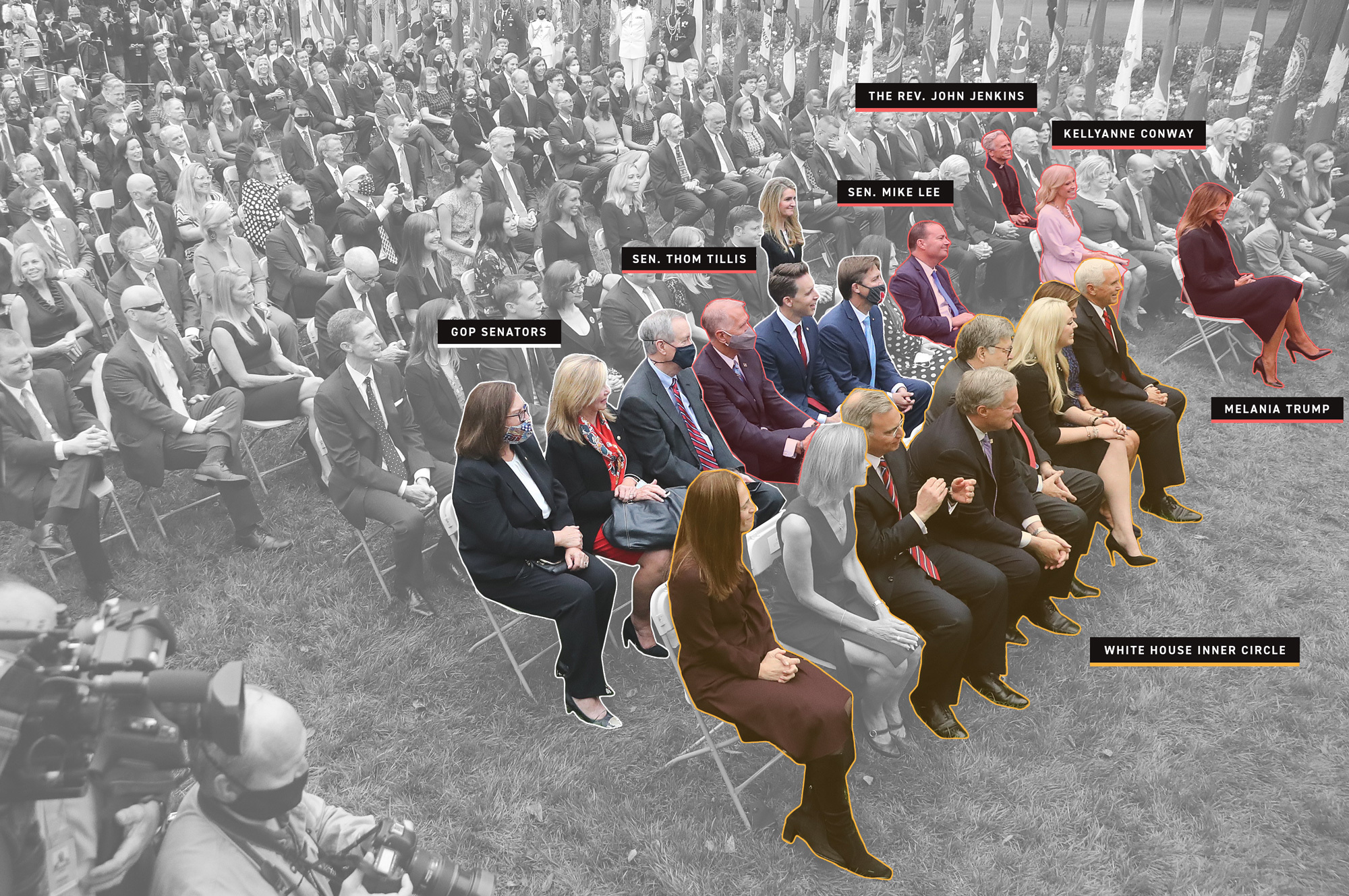 Nhiều người tham dự sự kiện được tổ chức tại Vườn Hồng bên trong Nhà Trắng không đeo khẩu trang, theo The Independent. Trong sự kiện này, tổng thống Trump thông báo thẩm phán Amy Coney Barrett được đề cử vào Tòa án Tối cao Mỹ, thay thế vị trí của bà Ruth Bader Ginsburg.
