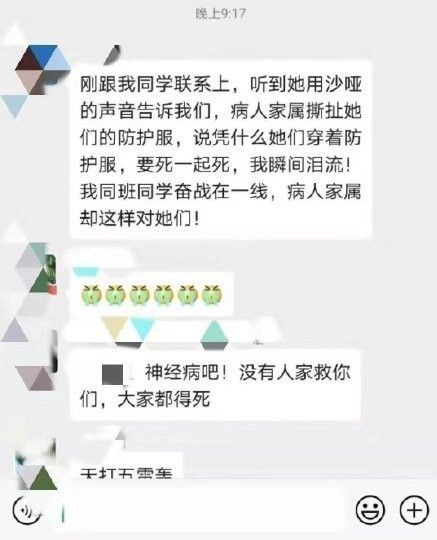 Bên cạnh đó, một bài viết được chia sẻ trên Weibo cho hay một bác sĩ ở Vũ Hán cũng có trải nghiệm tương tự. Theo đó, bác sĩ này bị người nhà của một bệnh nhân tức giận và xé áo do bệnh viện đã quá tải, mọi thứ đều thiêu thốn.