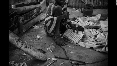 | Đứa trẻ đang cầm kinh Quran bị xích chân tại trường học - Ảnh chụp màn hình CNN |