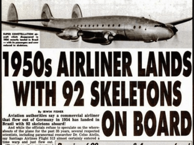 Toàn bộ sự việc liên quan đến chiếc máy bay bí ẩn này được đăng tải trên Weekly World News vào ngày 14/11/1989 với tựa đề gây sốc "1950s Airliner Lands With 92 Skeletons On Board" (tạm dịch: Chuyến bay từ thập niên 1950 trở về với 92 bộ xương trên khoang) do tác giả Irwin Fisher viết.