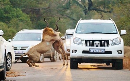 Từ trong rừng, con sư tử bất ngờ lao ra vồ một con linh dương trên đường cao tốc ngay trước mắt nhiều du khách, khiến họ sững sờ.