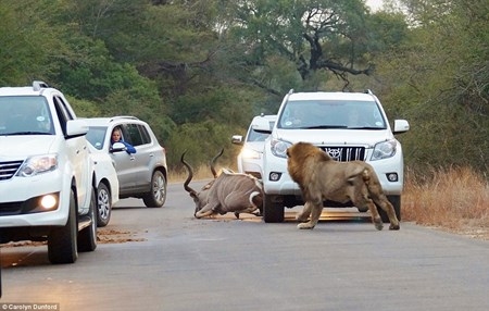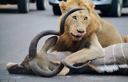 | "Con linh dương lao vụt ra từ những bụi cây, chạy vào giữa những chiếc xe hơi đang lưu thông trên đường cao tốc. Hai con sư tử rượt theo và bất chấp xe cộ, một con ngoạm lấy lưng của con mồi. Con thứ hai lao đến và cắn vào cổ họng của con linh dương. Cả hai con sử tử đã săn thành công con linh dương", Carolyn cho biết. |
