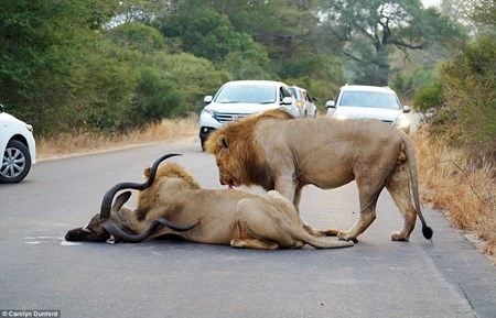 | Nhiếp ảnh gia nghiệp dư người Anh Carolyn Dunford, 23 tuổi đã nhanh tay "chộp" được những bức ảnh ghi lại cảnh săn mồi ấn tượng của 2 con sư tử trưởng thành ngay trên đường cao tốc xuyên qua Công viên quốc gia Kruger - một trong những khu bảo tồn động vật hoang dã lớn nhất ở Nam Phi. |
