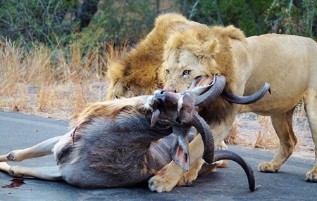 | Sau đó, hai con sử tử xé xác và "chén" con mồi chúng vừa săn được ngay trên đường cao tốc. |