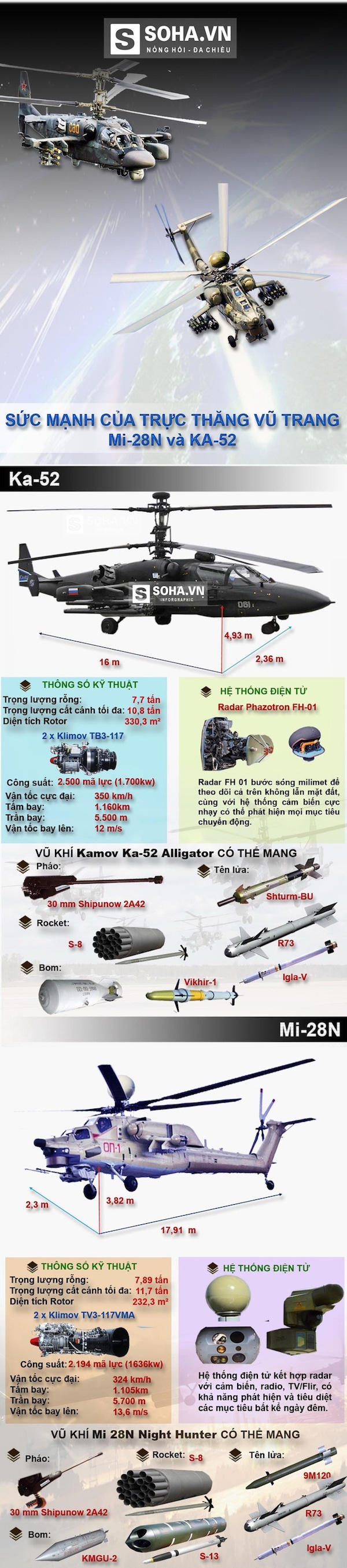 Theo hãng tin Sputnik, hai mẫu trực thăng vũ trang hiện đại nhất của Nga là Ka-52 và Mi-28N được cho là đã có mặt tại Syria để sẵn sàng chiến đấu.