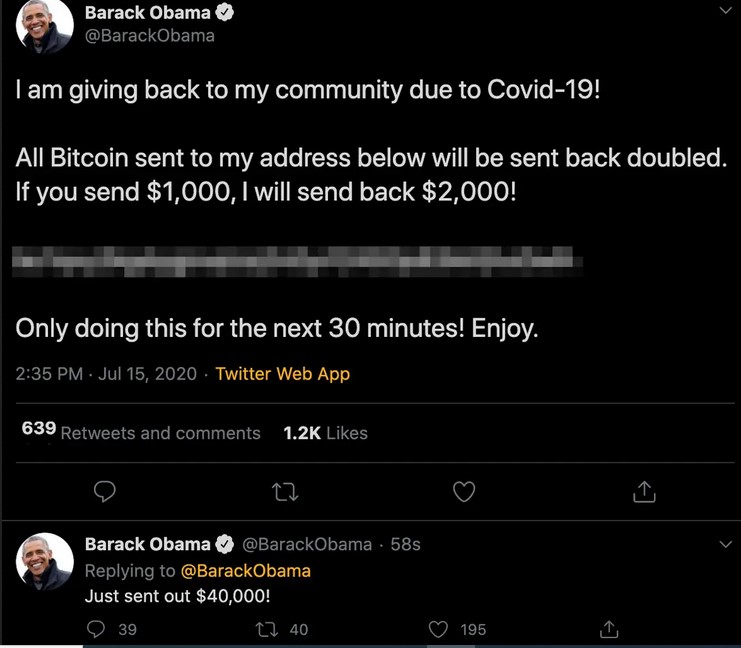 Bên cạnh đó, tài khoản Twitter của cựu tổng thống Mỹ Barack Obama, ca sĩ Kanye West và vợ là Kim Kardashian West, các tỷ phú Warren Buffett, Jeff Bezos và Mike Bloomberg dường như cũng đã bị hack và đăng tải những thông điệp giống nhau về việc chuyển tiền Bitcoin.