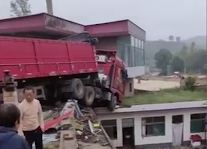 Tai nạn hy hữu xảy ra tại thị trấn Lữ Lương, tỉnh Sơn Tây (Trung Quốc) khiến chiếc xe tải mắc kẹt trên mái nhà ven đường.