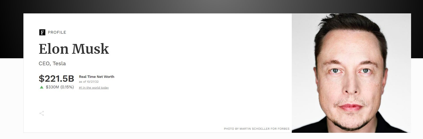 Ngày 25.10, tỉ phú Elon Musk - người giàu nhất hành tinh sở hữu khối tài sản 212 tỉ USD. Tuy nhiên, đến ngày 28.10, tài sản ròng của Elon Musk được Forbes ước tính lên tới 221,5 tỉ USD (tăng 9,5 tỉ USD chỉ sau 3 ngày).