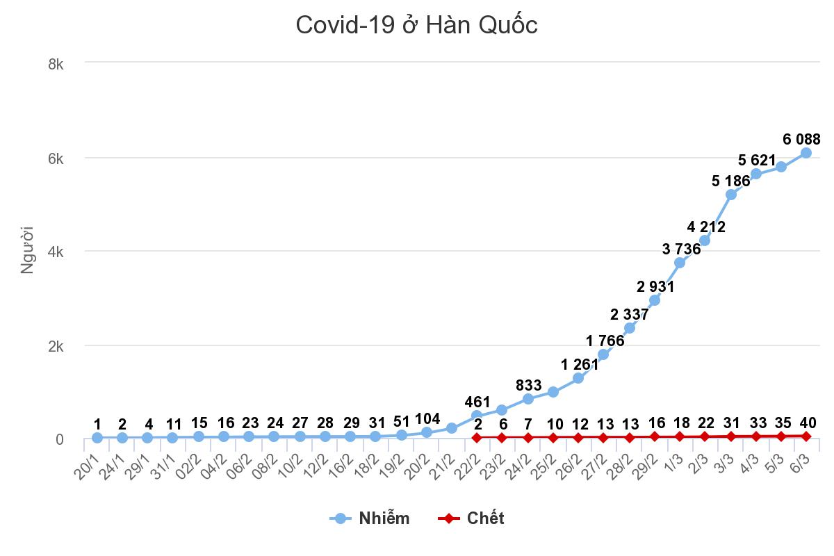 Hàn Quốc hiện là ổ Covid-19 lớn thứ hai thế giới với hơn 6.000 ca nhiễm nCoV và 40 ca tử vong. Gần 100 quốc gia và vùng lãnh thổ đã áp đặt lệnh hạn chế nhập cảnh Hàn Quốc hoặc quy trình cách ly nghiêm ngặt đối với người đến từ Hàn Quốc để ngăn dịch bệnh lây lan.